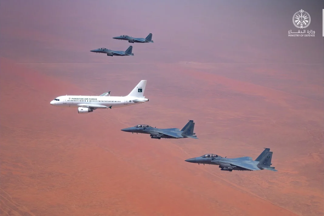 The rare military escort underscored the deepening strategic and brotherly ties between Saudi Arabia and Pakistan, ahead of the Prime Minister’s official engagements in the Kingdom.